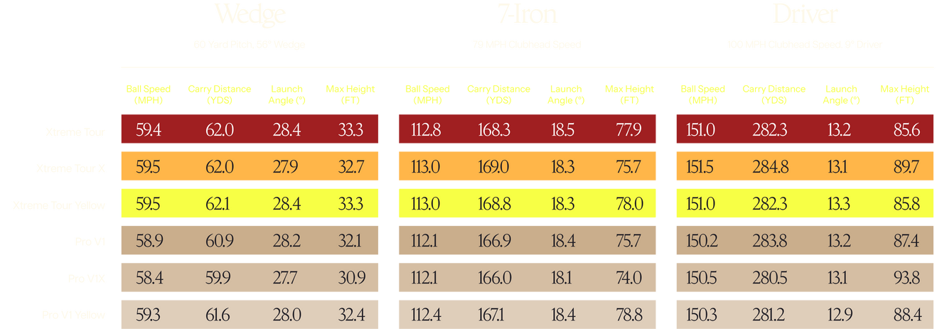 Data based on robot testing of PXG® Xtreme Tour and Xtreme Tour X golf balls versus Titleist® Pro V1, Pro V1 Yellow, and Pro V1x (released 2023) golf balls using Trackman® launch monitor. All trademarks used are the property of their respective owners and for identification purposes only. Parsons Xtreme Golf is not affiliated with Acushnet Company.