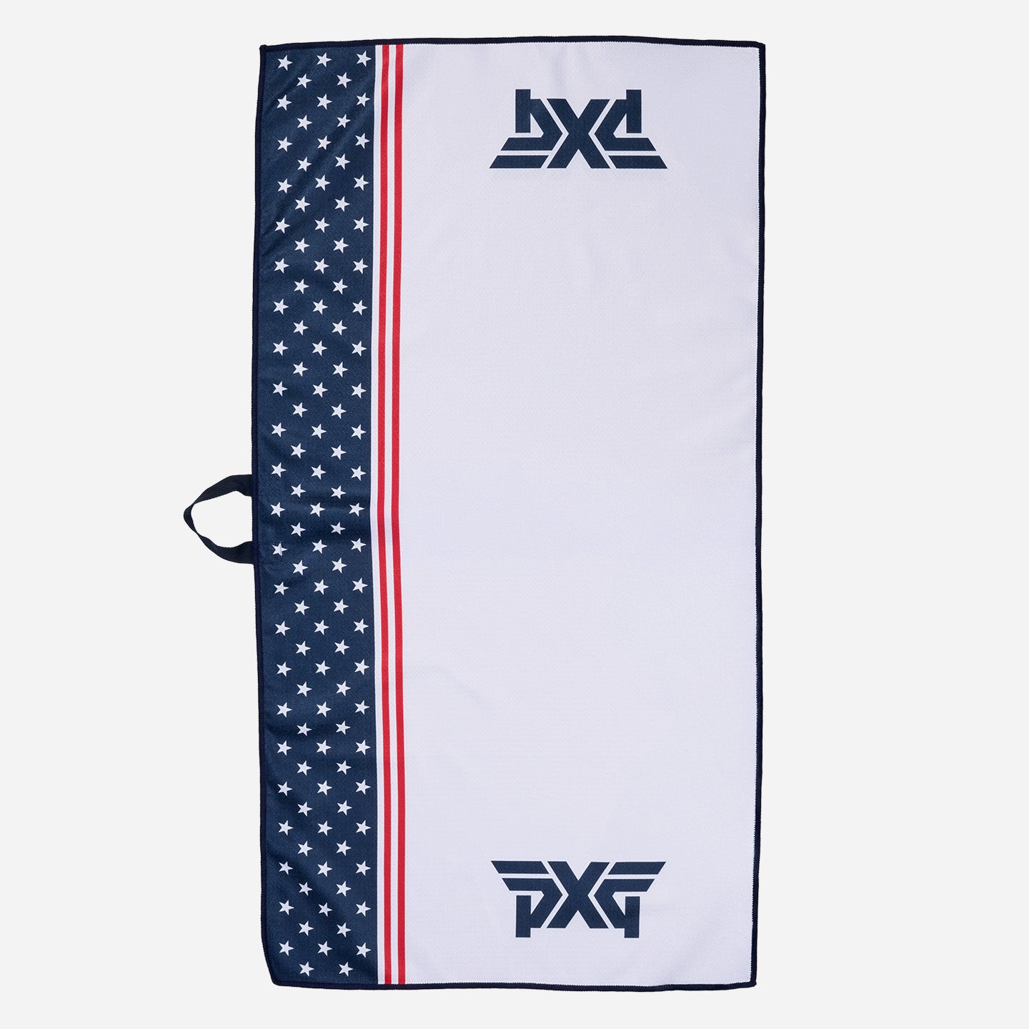 Shine up your clubs in the star-spangled glory of our Stars & Stripes Players Towel. The microfiber waffle weave towel removes dirt from club grooves without scratching and dries quickly for all-day use. Patterned with white stars on navy and accented with red stripes and two PXG logos, this towel adds the perfect all-American touch to your golf bag.