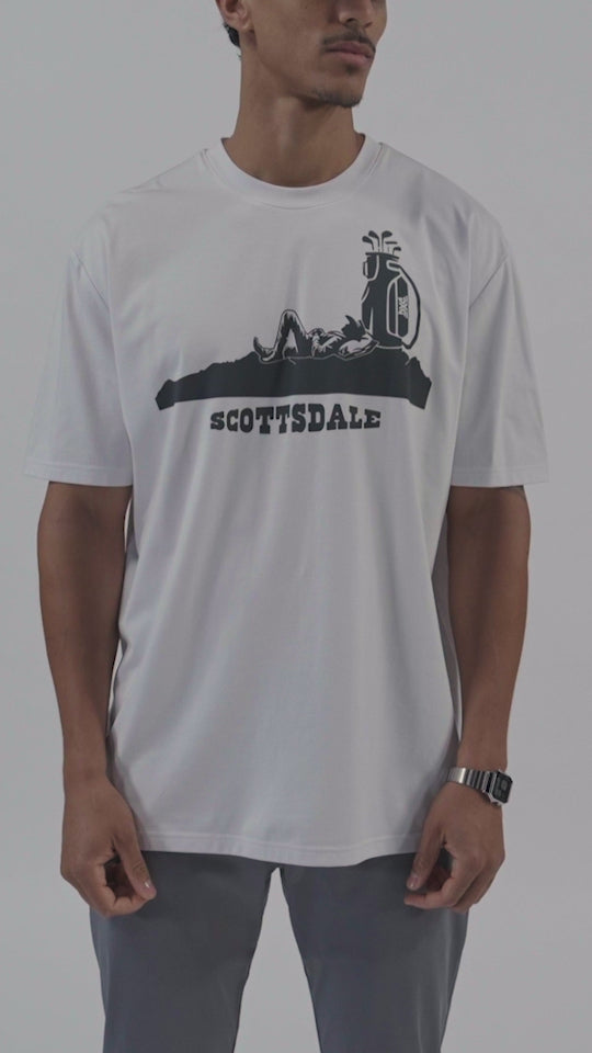 Embrace all things golf with our Giddy Up Tee. This white tee features a Uniform Grey screenprint of a cowboy golfer resting against a bag of PXG clubs with Scottsdale underneath — the epitome of a day in paradise for any golfer. Made from a soft, breathable two-way stretch Sorona cotton blend, you’ll want to wear this t-shirt on and off the course.