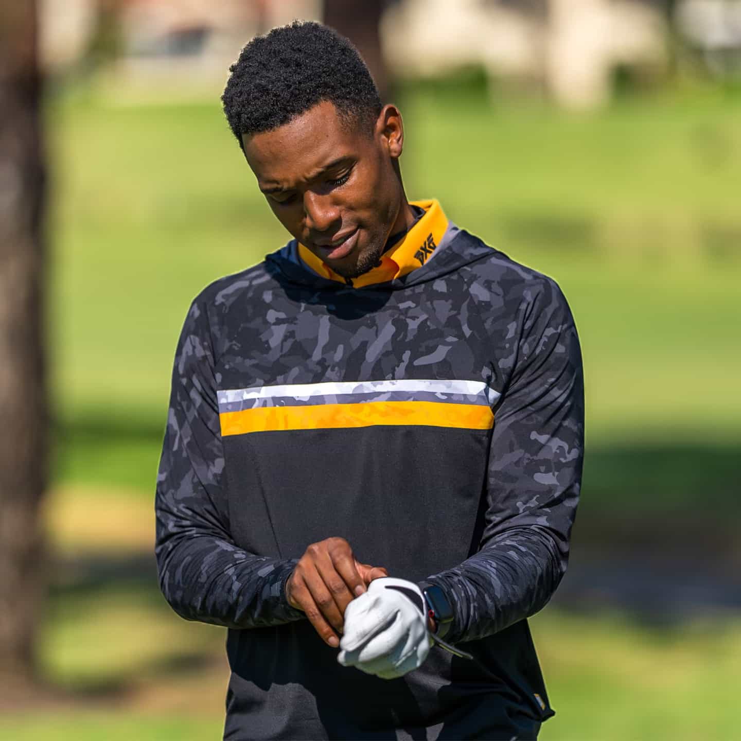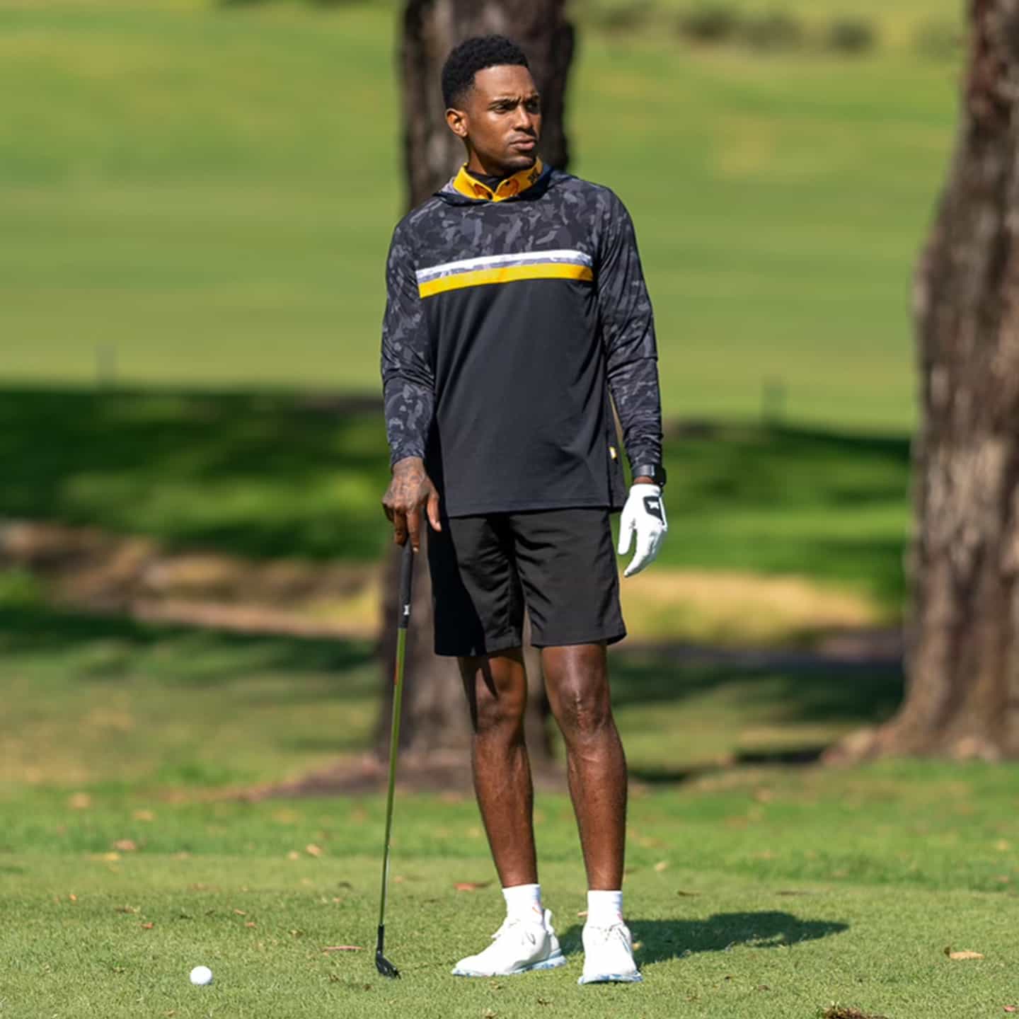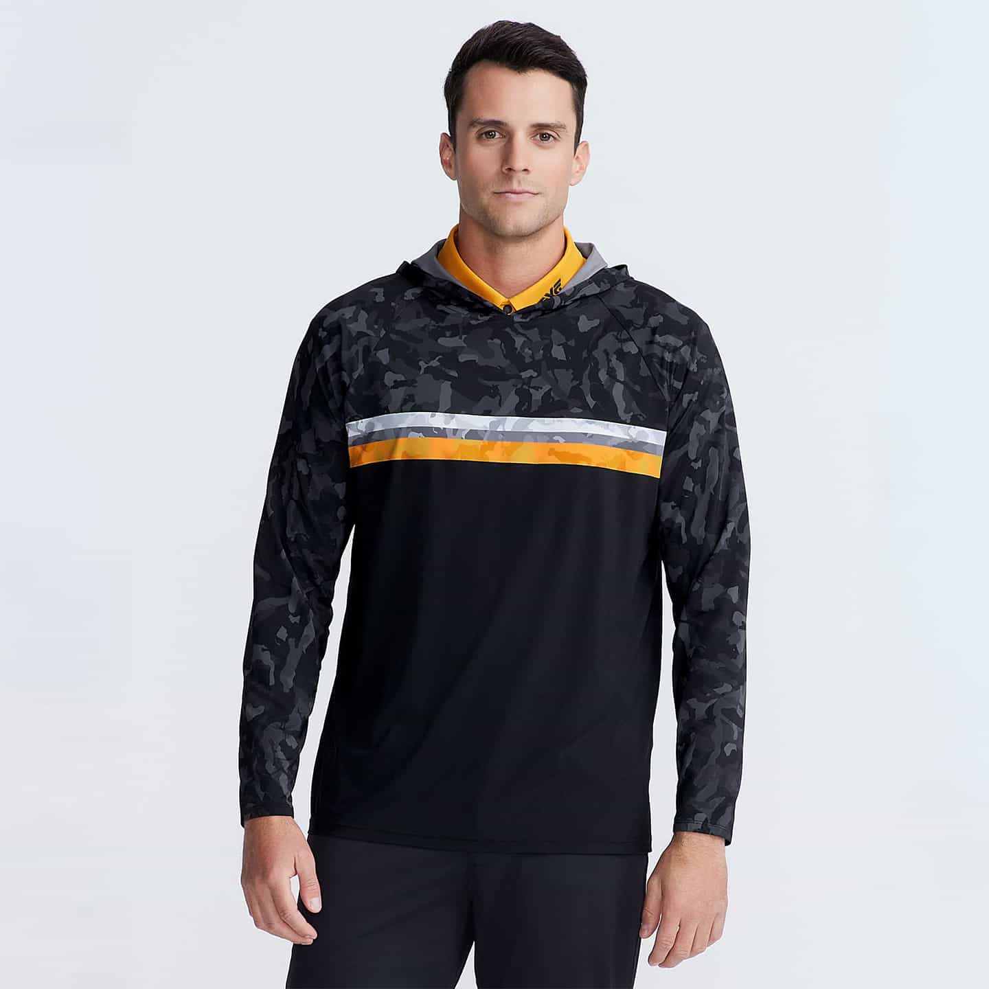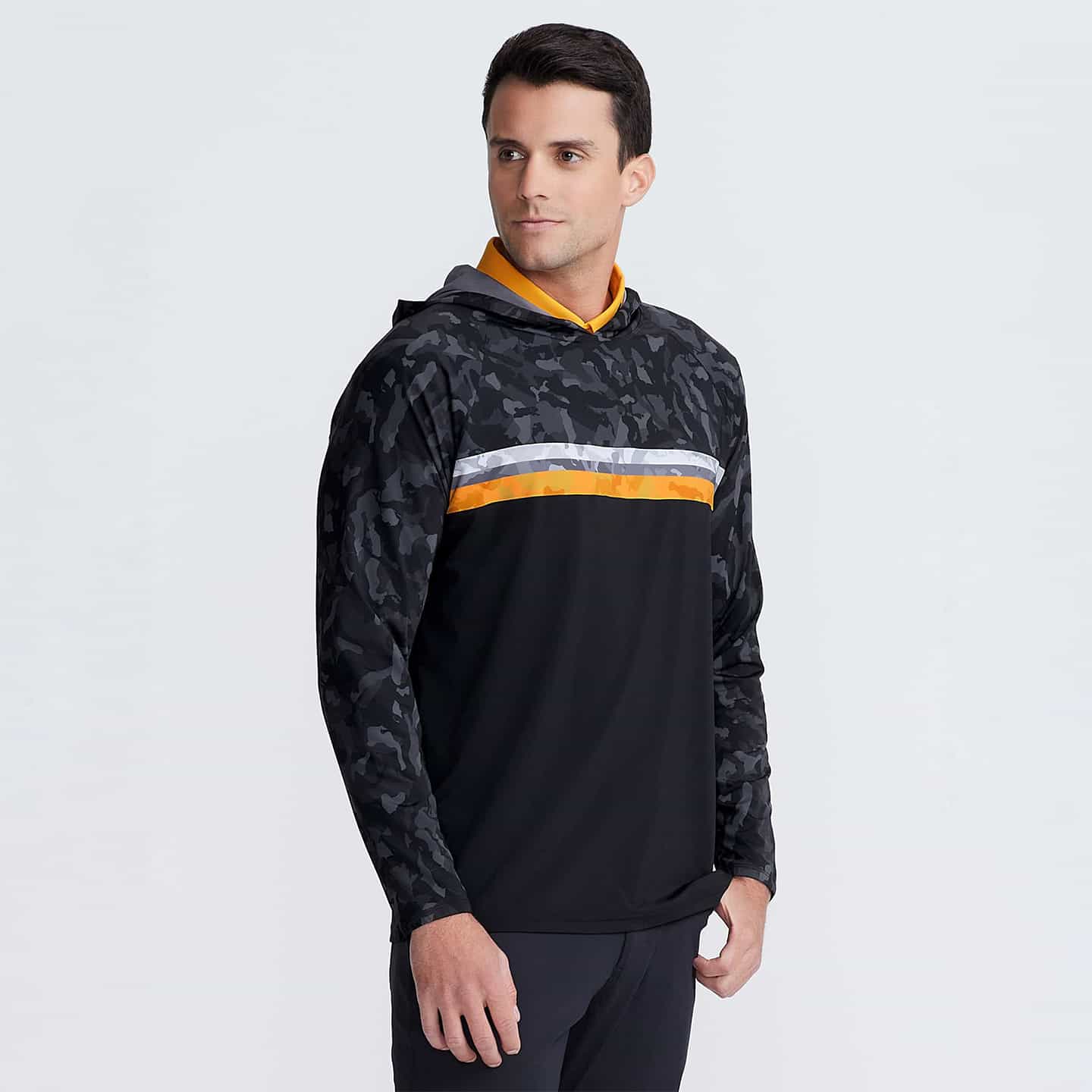 See full detailsAdd a lightweight layer to cool days with our Hooded Fairway Camo Raglan Pullover. Featuring our Fairway Camo print in black and gray on the upper chest, arms, and back body along with a tricolor chest stripe, this hoodie is quick-dry and moisture wicking with UV protection. It also features a snap-down hood, making it perfect for the range or your morning jog.