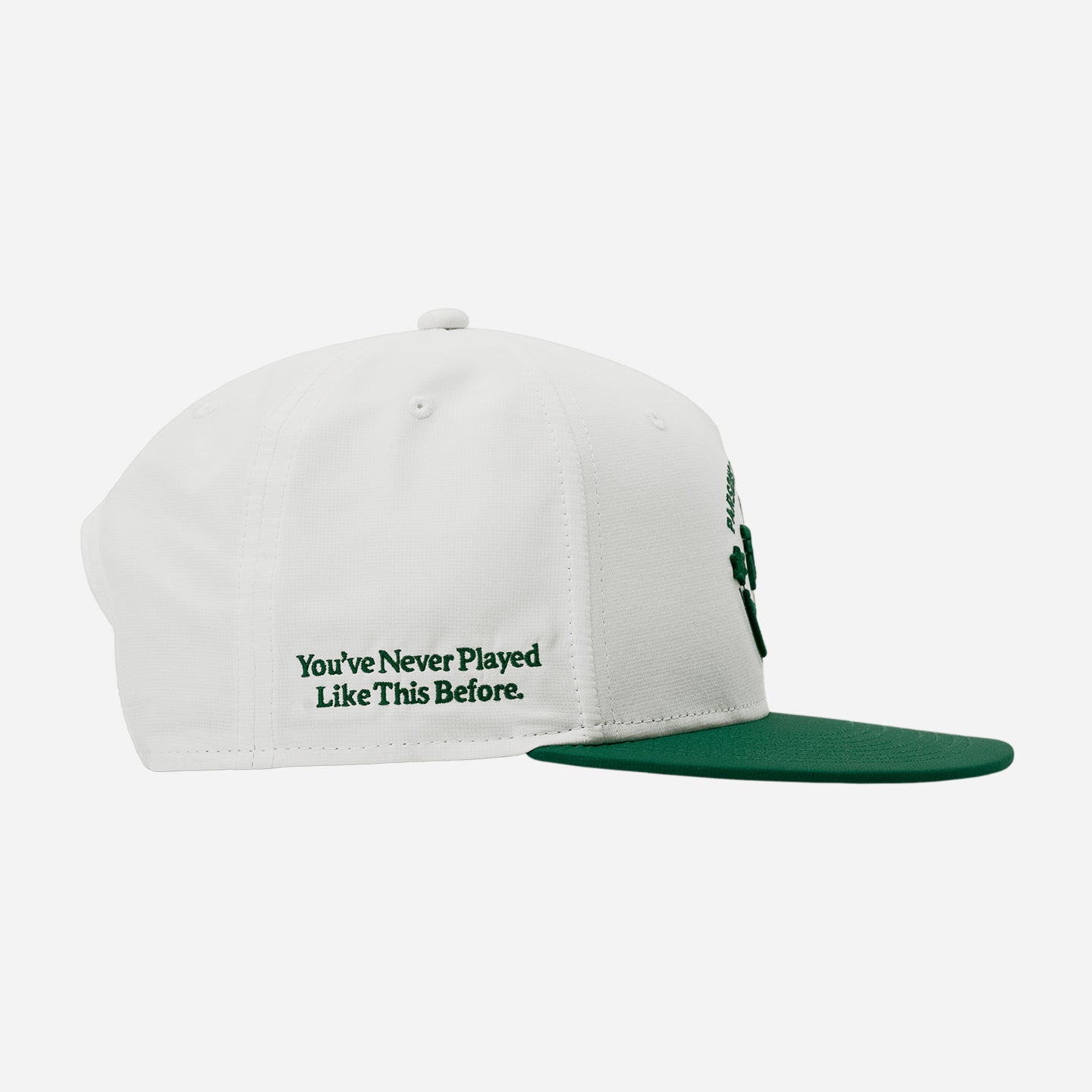 Crisp and course-ready, the PXG Driver 5-Panel Flat Bill Snapback Cap pairs a clean white crown with a bold green embroidered front graphic and a matching green flat bill for sharp contrast. The streamlined 5-panel build delivers a structured fit, while the snapback closure makes it easy to adjust for all-day comfort. Small embroidered PXG logos on the sides and back add subtle detail from every angle.