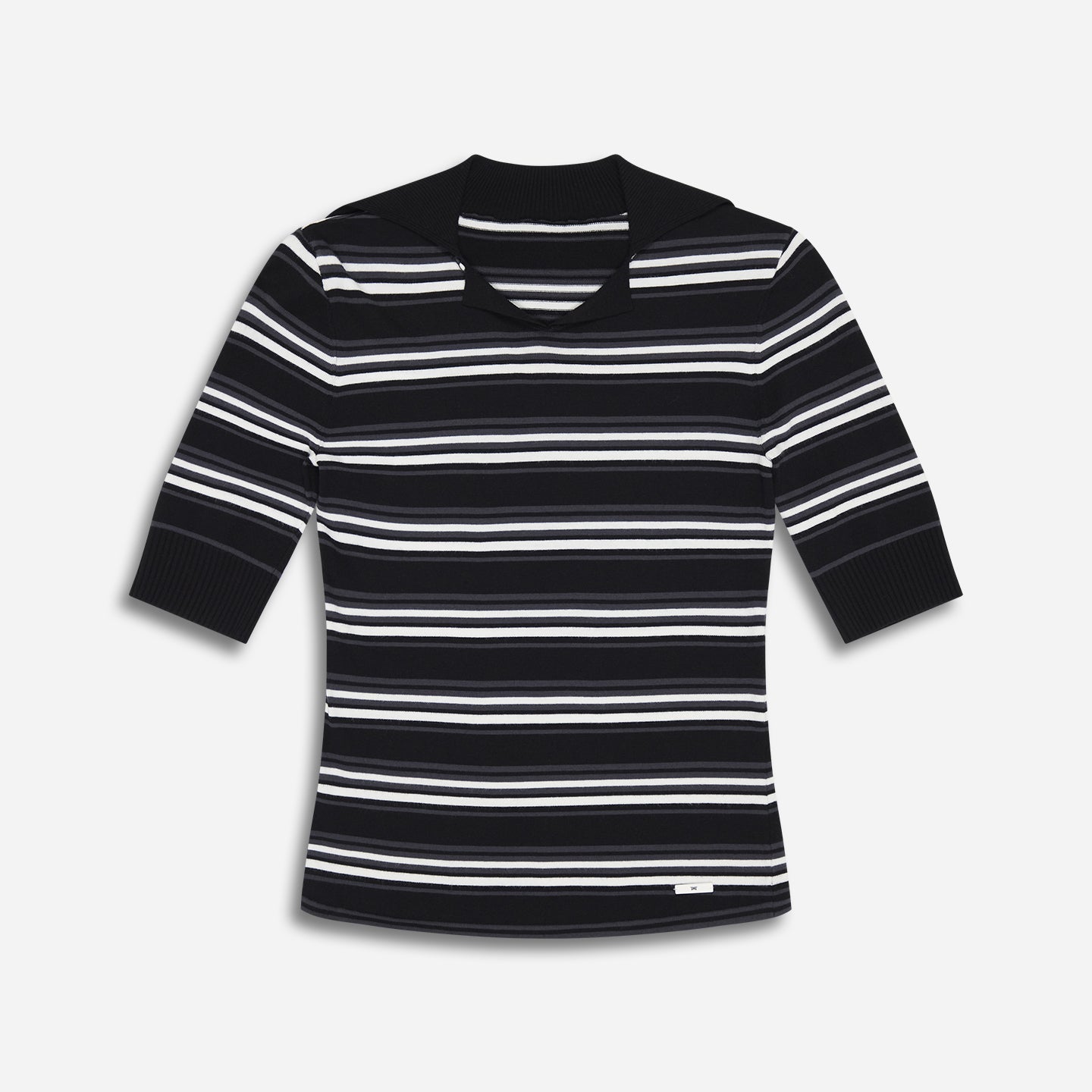 Our Lapel Knitted Top brings effortless style to your everyday. Designed with a lapel collar and sailor neckline on the back, this comfortable, silky knit top has a flattering modern stripe pattern and ribbed cuff sleeve. Pair yours with a golf skirt or pants on the course, or with jeans on the weekend for a laid-back vibe.