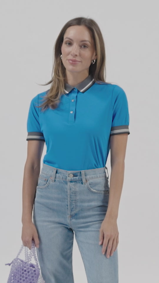 Our Women’s Ready to Play Polo is ready for the course or a day out on the town. Featured in both Black and our seasonal Cadet Blue colorways, it’s made with an elevated Italian fabric that is sustainable and breathable, with UV protection for all-day comfort. This polished polo features a lustrous texture, along with a ribbed collar and sleeves with stripe details for added elegance. Pair yours with our Saturday Skirt for a classically chic look.